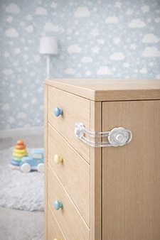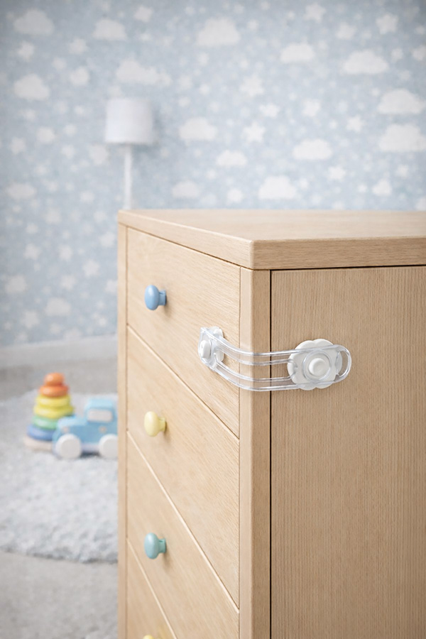 Cierre para muebles de difícil apertura para los niños. Latiguillo flexible de goma transparente y anclajes de plástico ABS con adhesivo de alta calidad.